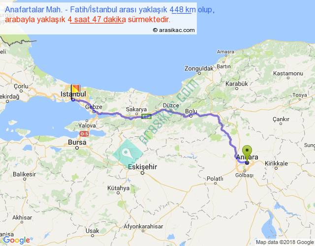Anafartalar Mah. - Fatih İstanbul arası yaklaşık olarak 90 km/h ile yukarıda belirtilen sürede olup, iki yerin kuş uçuşu uzaklığı (mesafesi) 350'dir. Eğer belirtilen yerler arasında uçak seferi var ise bu süre uçakla 32 dakika'ya kadar düşebilir. Yolculuk otobüsle 6 saat 13 dakika sürmektedir.