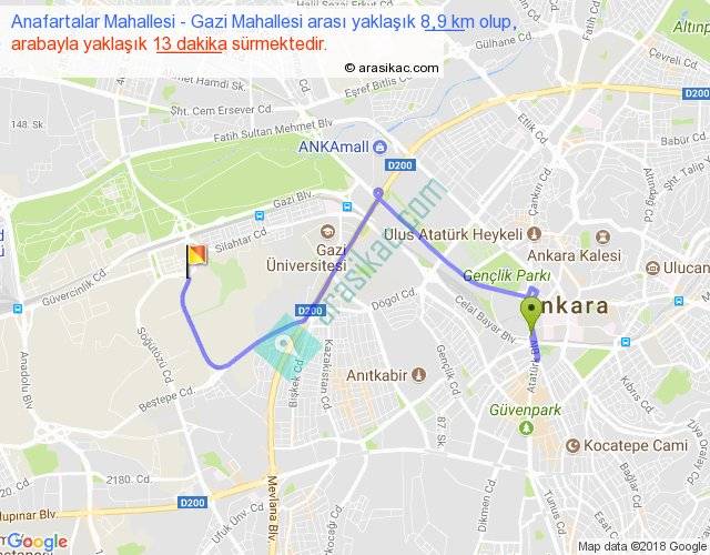 Anafartalar Mahallesi - Gazi Mahallesi arası yaklaşık olarak 90 km/h ile yukarıda belirtilen sürede olup, iki yerin kuş uçuşu uzaklığı (mesafesi) 5'dir. Yolculuk otobüsle 16 dakika sürmektedir.