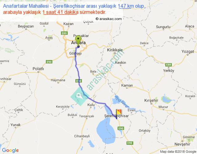 Anafartalar Mahallesi - Şereflikoçhisar arası yaklaşık olarak 90 km/h ile yukarıda belirtilen sürede olup, iki yerin kuş uçuşu uzaklığı (mesafesi) 124'dir. Yolculuk otobüsle 2 saat 11 dakika sürmektedir.