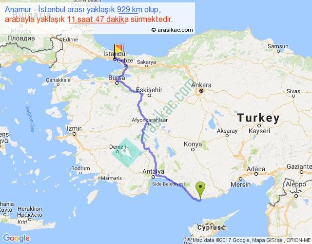 Anamur - İstanbul arası yaklaşık olarak 90 km/h ile yukarıda belirtilen sürede olup, iki yerin kuş uçuşu uzaklığı (mesafesi) 639'dir. Eğer belirtilen yerler arasında uçak seferi var ise bu süre uçakla 58 dakika'ya kadar düşebilir. Yolculuk otobüsle 15 saat 19 dakika sürmektedir.