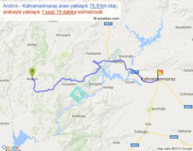Andırın - Kahramanmaraş arası yaklaşık olarak 90 km/h ile yukarıda belirtilen sürede olup, iki yerin kuş uçuşu uzaklığı (mesafesi) 50'dir. Yolculuk otobüsle 1 saat 42 dakika sürmektedir.