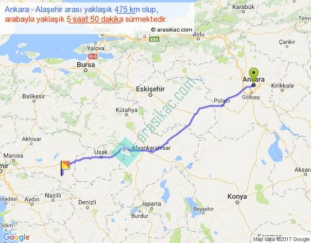 Ankara - Alaşehir arası yaklaşık olarak 90 km/h ile yukarıda belirtilen sürede olup, iki yerin kuş uçuşu uzaklığı (mesafesi) 411'dir. Eğer belirtilen yerler arasında uçak seferi var ise bu süre uçakla 37 dakika'ya kadar düşebilir. Yolculuk otobüsle 7 saat 35 dakika sürmektedir.