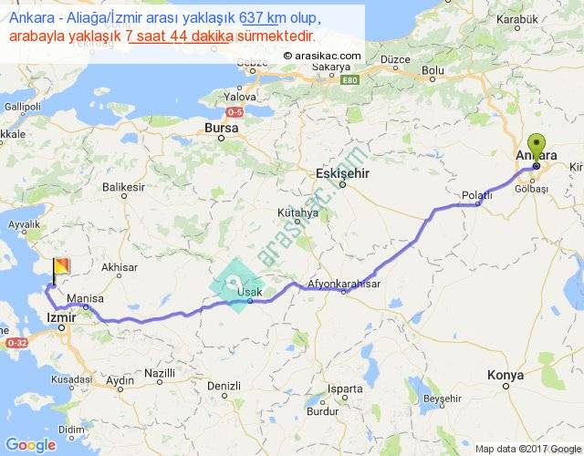 Ankara - Aliağa İzmir arası yaklaşık olarak 90 km/h ile yukarıda belirtilen sürede olup, iki yerin kuş uçuşu uzaklığı (mesafesi) 511'dir. Eğer belirtilen yerler arasında uçak seferi var ise bu süre uçakla 47 dakika'ya kadar düşebilir. Yolculuk otobüsle 10 saat 3 dakika sürmektedir.
