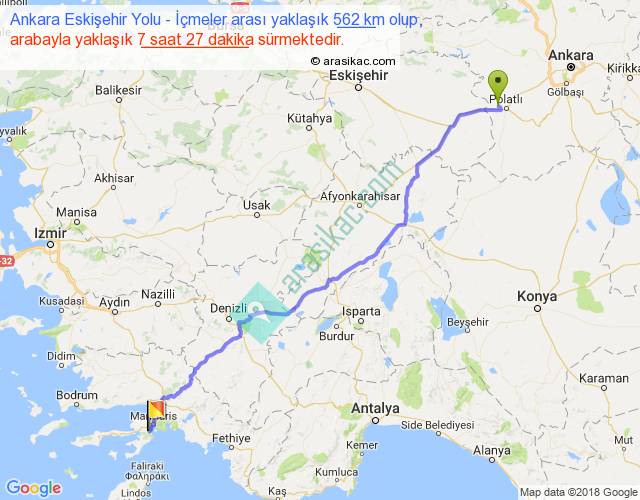 Ankara Eskişehir Yolu - İçmeler arası yaklaşık olarak 90 km/h ile yukarıda belirtilen sürede olup, iki yerin kuş uçuşu uzaklığı (mesafesi) 455'dir. Eğer belirtilen yerler arasında uçak seferi var ise bu süre uçakla 42 dakika'ya kadar düşebilir. Yolculuk otobüsle 9 saat 41 dakika sürmektedir.