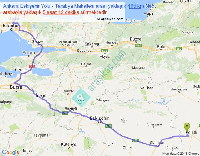 Ankara Eskişehir Yolu - Tarabya Mahallesi arası yaklaşık olarak 90 km/h ile yukarıda belirtilen sürede olup, iki yerin kuş uçuşu uzaklığı (mesafesi) 305'dir. Eğer belirtilen yerler arasında uçak seferi var ise bu süre uçakla 28 dakika'ya kadar düşebilir. Yolculuk otobüsle 6 saat 45 dakika sürmektedir.