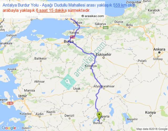 Antalya Burdur Yolu - Aşağı Dudullu Mahallesi arası yaklaşık olarak 90 km/h ile yukarıda belirtilen sürede olup, iki yerin kuş uçuşu uzaklığı (mesafesi) 382'dir. Eğer belirtilen yerler arasında uçak seferi var ise bu süre uçakla 35 dakika'ya kadar düşebilir. Yolculuk otobüsle 8 saat 7 dakika sürmektedir.