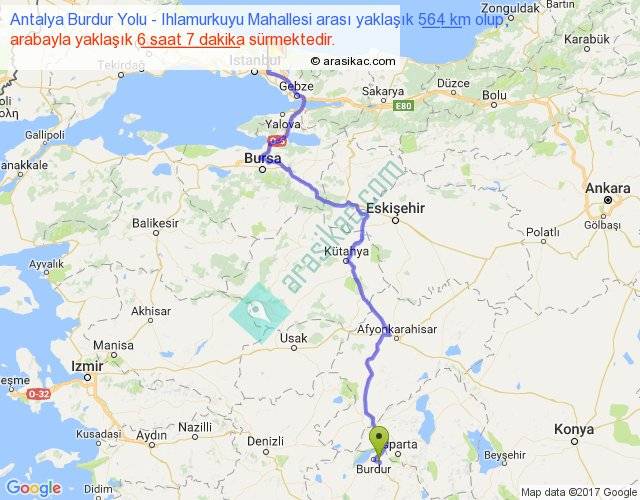 Antalya Burdur Yolu - Ihlamurkuyu Mahallesi arası yaklaşık olarak 90 km/h ile yukarıda belirtilen sürede olup, iki yerin kuş uçuşu uzaklığı (mesafesi) 382'dir. Eğer belirtilen yerler arasında uçak seferi var ise bu süre uçakla 35 dakika'ya kadar düşebilir. Yolculuk otobüsle 7 saat 57 dakika sürmektedir.
