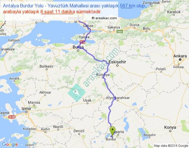 Antalya Burdur Yolu - Yavuztürk Mahallesi arası yaklaşık olarak 90 km/h ile yukarıda belirtilen sürede olup, iki yerin kuş uçuşu uzaklığı (mesafesi) 386'dir. Eğer belirtilen yerler arasında uçak seferi var ise bu süre uçakla 35 dakika'ya kadar düşebilir. Yolculuk otobüsle 8 saat 2 dakika sürmektedir.