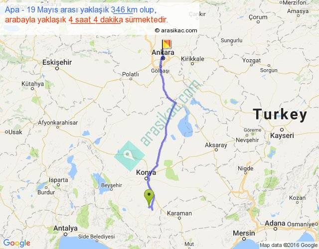 Apa - 19 Mayıs arası yaklaşık olarak 90 km/h ile yukarıda belirtilen sürede olup, iki yerin kuş uçuşu uzaklığı (mesafesi) 291'dir. Eğer belirtilen yerler arasında uçak seferi var ise bu süre uçakla 26 dakika'ya kadar düşebilir. Yolculuk otobüsle 5 saat 17 dakika sürmektedir.