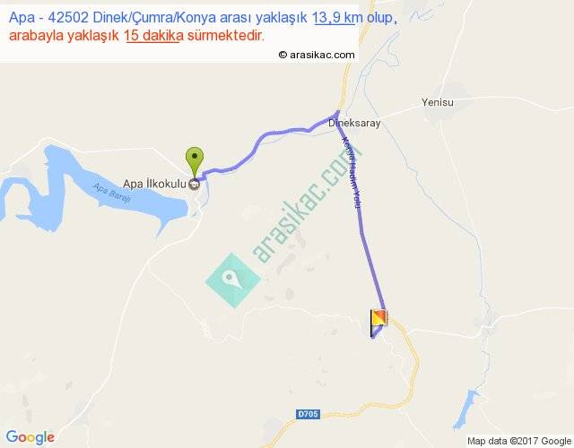 Apa - 42502 Dinek Çumra Konya arası yaklaşık olarak 90 km/h ile yukarıda belirtilen sürede olup, iki yerin kuş uçuşu uzaklığı (mesafesi) 8'dir. Yolculuk otobüsle 19 dakika sürmektedir.