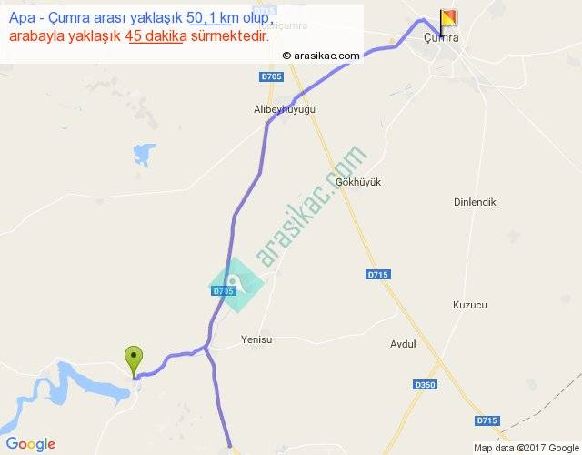 Apa - Çumra arası yaklaşık olarak 90 km/h ile yukarıda belirtilen sürede olup, iki yerin kuş uçuşu uzaklığı (mesafesi) 30'dir. Yolculuk otobüsle 58 dakika sürmektedir.