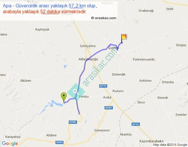 Apa - Güvercinlik arası yaklaşık olarak 90 km/h ile yukarıda belirtilen sürede olup, iki yerin kuş uçuşu uzaklığı (mesafesi) 34'dir. Yolculuk otobüsle 1 saat 7 dakika sürmektedir.
