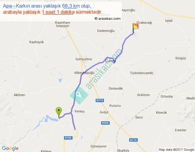 Apa - Karkın arası yaklaşık olarak 90 km/h ile yukarıda belirtilen sürede olup, iki yerin kuş uçuşu uzaklığı (mesafesi) 45'dir. Yolculuk otobüsle 1 saat 19 dakika sürmektedir.