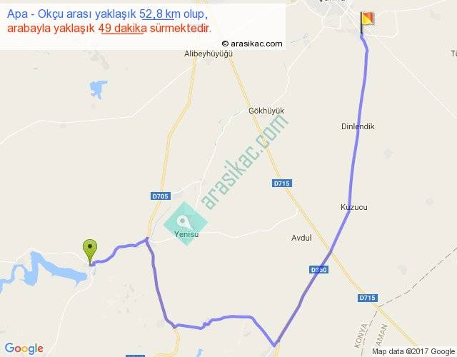 Apa - Okçu arası yaklaşık olarak 90 km/h ile yukarıda belirtilen sürede olup, iki yerin kuş uçuşu uzaklığı (mesafesi) 30'dir. Yolculuk otobüsle 1 saat 3 dakika sürmektedir.