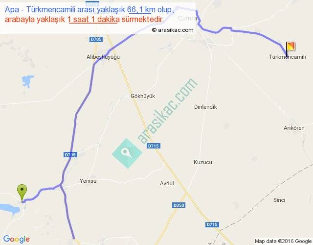 Apa - Türkmencamili arası yaklaşık olarak 90 km/h ile yukarıda belirtilen sürede olup, iki yerin kuş uçuşu uzaklığı (mesafesi) 37'dir. Yolculuk otobüsle 1 saat 19 dakika sürmektedir.