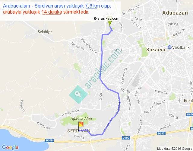 Arabacıalanı - Serdivan arası yaklaşık olarak 90 km/h ile yukarıda belirtilen sürede olup, iki yerin kuş uçuşu uzaklığı (mesafesi) 5'dir. Yolculuk otobüsle 18 dakika sürmektedir.