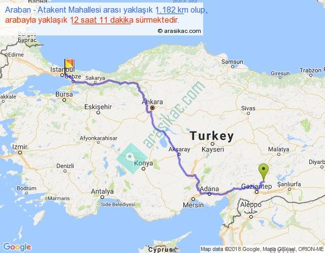 Araban - Atakent Mahallesi arası yaklaşık olarak 90 km/h ile yukarıda belirtilen sürede olup, iki yerin kuş uçuşu uzaklığı (mesafesi) 835'dir. Eğer belirtilen yerler arasında uçak seferi var ise bu süre uçakla 1 saat 17 dakika'ya kadar düşebilir. Yolculuk otobüsle 15 saat 50 dakika sürmektedir.