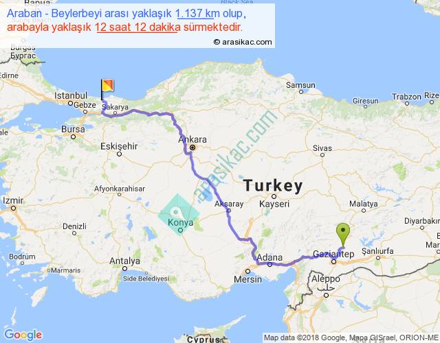 Araban - Beylerbeyi arası yaklaşık olarak 90 km/h ile yukarıda belirtilen sürede olup, iki yerin kuş uçuşu uzaklığı (mesafesi) 772'dir. Eğer belirtilen yerler arasında uçak seferi var ise bu süre uçakla 1 saat 11 dakika'ya kadar düşebilir. Yolculuk otobüsle 15 saat 51 dakika sürmektedir.