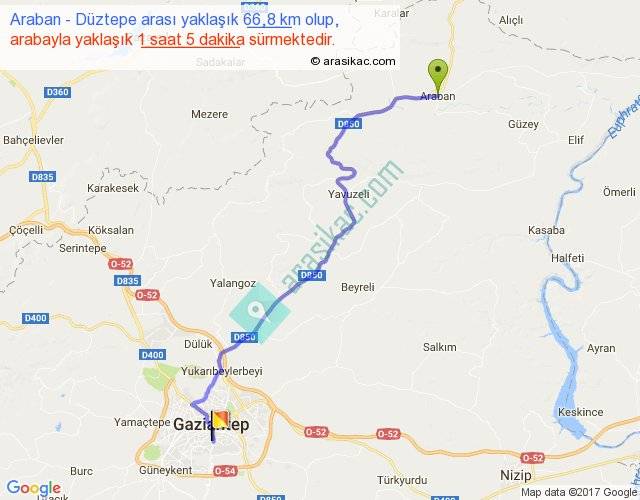 Araban - Düztepe arası yaklaşık olarak 90 km/h ile yukarıda belirtilen sürede olup, iki yerin kuş uçuşu uzaklığı (mesafesi) 50'dir. Yolculuk otobüsle 1 saat 24 dakika sürmektedir.