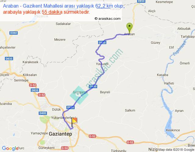 Araban - Gazikent Mahallesi arası yaklaşık olarak 90 km/h ile yukarıda belirtilen sürede olup, iki yerin kuş uçuşu uzaklığı (mesafesi) 43'dir. Yolculuk otobüsle 1 saat 11 dakika sürmektedir.