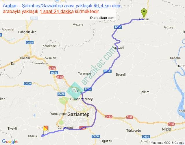 Araban - Şahinbey Gaziantep arası yaklaşık olarak 90 km/h ile yukarıda belirtilen sürede olup, iki yerin kuş uçuşu uzaklığı (mesafesi) 64'dir. Yolculuk otobüsle 1 saat 49 dakika sürmektedir.