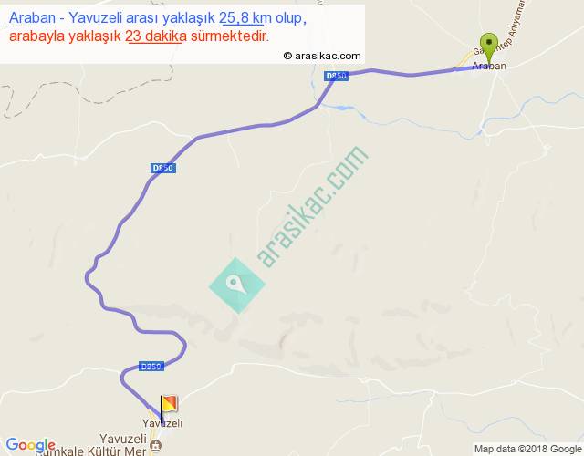 Araban - Yavuzeli arası yaklaşık olarak 90 km/h ile yukarıda belirtilen sürede olup, iki yerin kuş uçuşu uzaklığı (mesafesi) 16'dir. Yolculuk otobüsle 29 dakika sürmektedir.