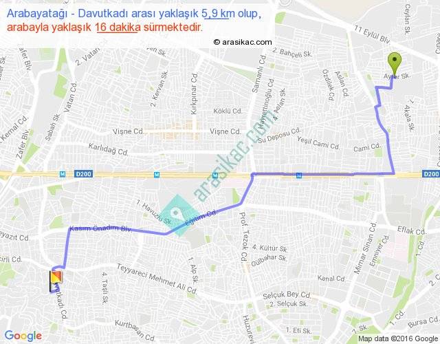 Arabayatağı - Davutkadı arası yaklaşık olarak 90 km/h ile yukarıda belirtilen sürede olup, iki yerin kuş uçuşu uzaklığı (mesafesi) 4'dir. Yolculuk otobüsle 20 dakika sürmektedir.