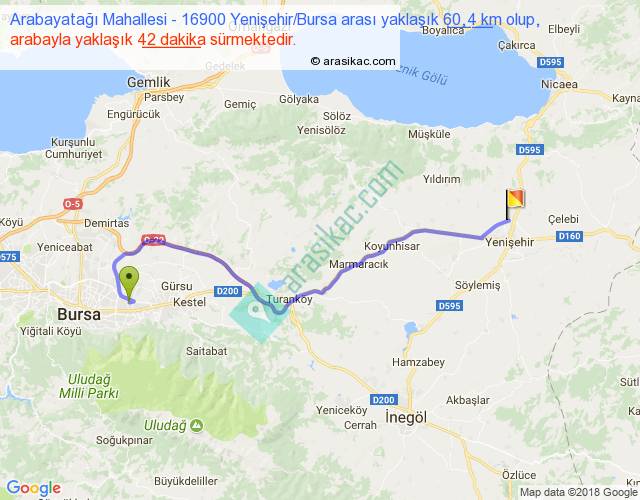 Arabayatağı Mahallesi - 16900 Yenişehir Bursa arası yaklaşık olarak 90 km/h ile yukarıda belirtilen sürede olup, iki yerin kuş uçuşu uzaklığı (mesafesi) 45'dir. Yolculuk otobüsle 54 dakika sürmektedir.