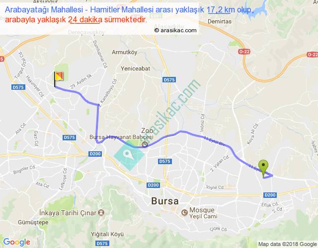 Arabayatağı Mahallesi - Hamitler Mahallesi arası yaklaşık olarak 90 km/h ile yukarıda belirtilen sürede olup, iki yerin kuş uçuşu uzaklığı (mesafesi) 13'dir. Yolculuk otobüsle 31 dakika sürmektedir.