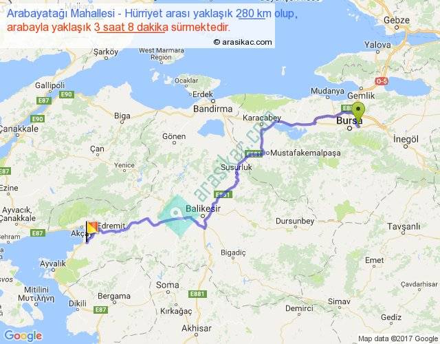 Arabayatağı Mahallesi - Hürriyet arası yaklaşık olarak 90 km/h ile yukarıda belirtilen sürede olup, iki yerin kuş uçuşu uzaklığı (mesafesi) 200'dir. Yolculuk otobüsle 4 saat 4 dakika sürmektedir.