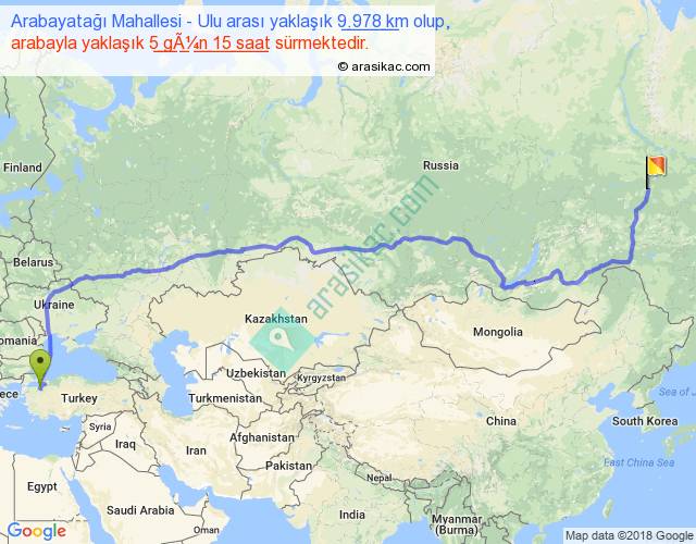 Arabayatağı Mahallesi - Ulu arası yaklaşık olarak 90 km/h ile yukarıda belirtilen sürede olup, iki yerin kuş uçuşu uzaklığı (mesafesi) 6588'dir. Eğer belirtilen yerler arasında uçak seferi var ise bu süre uçakla 10 saat 08 dakika'ya kadar düşebilir. Yolculuk otobüsle 7 gün 7 saat sürmektedir.