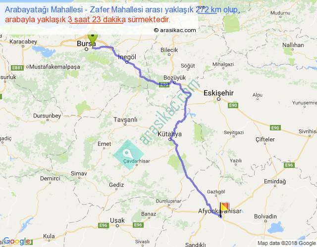 Arabayatağı Mahallesi - Zafer Mahallesi arası yaklaşık olarak 90 km/h ile yukarıda belirtilen sürede olup, iki yerin kuş uçuşu uzaklığı (mesafesi) 202'dir. Yolculuk otobüsle 4 saat 23 dakika sürmektedir.