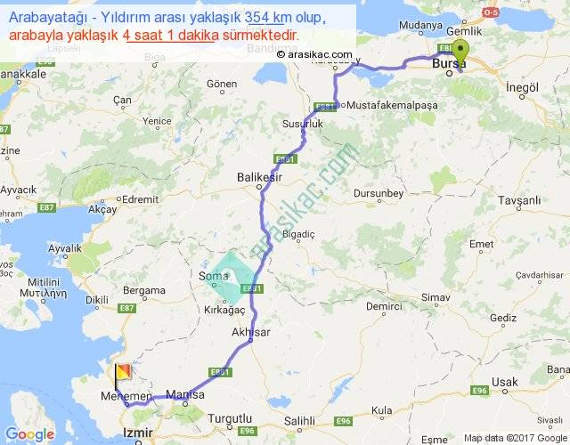 Arabayatağı - Yıldırım arası yaklaşık olarak 90 km/h ile yukarıda belirtilen sürede olup, iki yerin kuş uçuşu uzaklığı (mesafesi) 247'dir. Yolculuk otobüsle 5 saat 13 dakika sürmektedir.