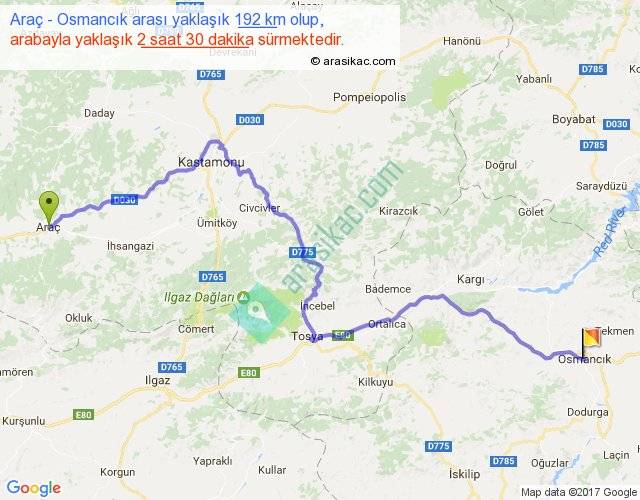 Araç - Osmancık arası yaklaşık olarak 90 km/h ile yukarıda belirtilen sürede olup, iki yerin kuş uçuşu uzaklığı (mesafesi) 126'dir. Yolculuk otobüsle 3 saat 15 dakika sürmektedir.