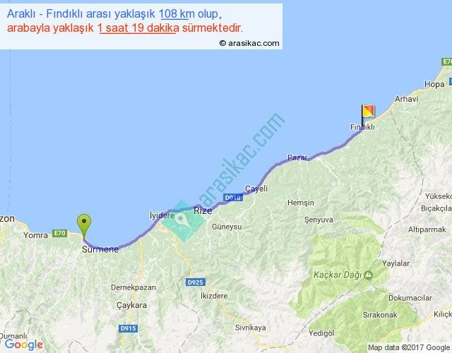 Araklı - Fındıklı arası yaklaşık olarak 90 km/h ile yukarıda belirtilen sürede olup, iki yerin kuş uçuşu uzaklığı (mesafesi) 97'dir. Yolculuk otobüsle 1 saat 42 dakika sürmektedir.