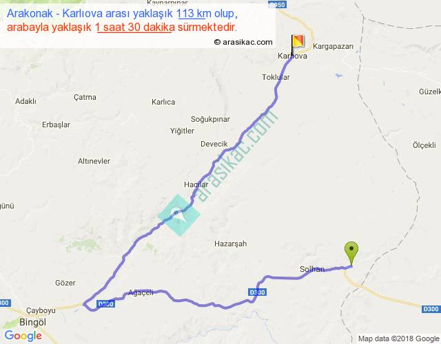 Arakonak - Karlıova arası yaklaşık olarak 90 km/h ile yukarıda belirtilen sürede olup, iki yerin kuş uçuşu uzaklığı (mesafesi) 37'dir. Yolculuk otobüsle 1 saat 57 dakika sürmektedir.