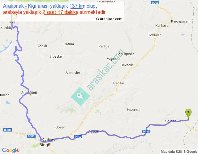Arakonak - Kiğı arası yaklaşık olarak 90 km/h ile yukarıda belirtilen sürede olup, iki yerin kuş uçuşu uzaklığı (mesafesi) 77'dir. Yolculuk otobüsle 2 saat 58 dakika sürmektedir.