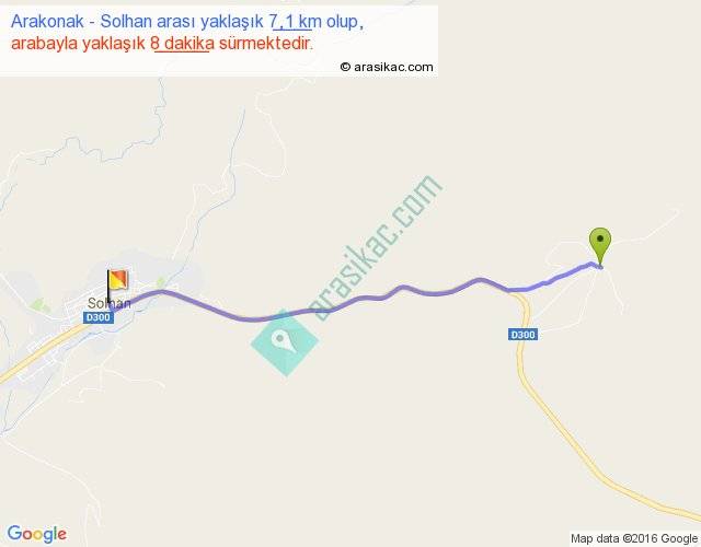 Arakonak - Solhan arası yaklaşık olarak 90 km/h ile yukarıda belirtilen sürede olup, iki yerin kuş uçuşu uzaklığı (mesafesi) 7'dir. Yolculuk otobüsle 10 dakika sürmektedir.
