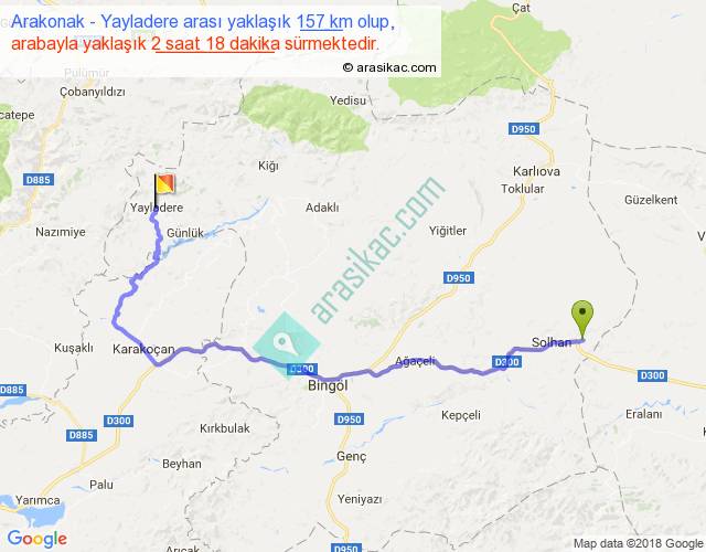Arakonak - Yayladere arası yaklaşık olarak 90 km/h ile yukarıda belirtilen sürede olup, iki yerin kuş uçuşu uzaklığı (mesafesi) 95'dir. Yolculuk otobüsle 2 saat 59 dakika sürmektedir.
