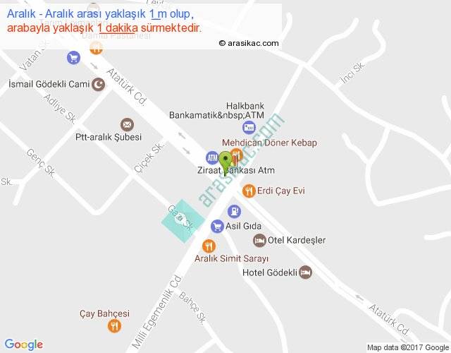 Aralık - Aralık arası yaklaşık olarak 90 km/h ile yukarıda belirtilen sürede olup, iki yerin kuş uçuşu uzaklığı (mesafesi) 0'dir. Yolculuk otobüsle 1 dakika sürmektedir.