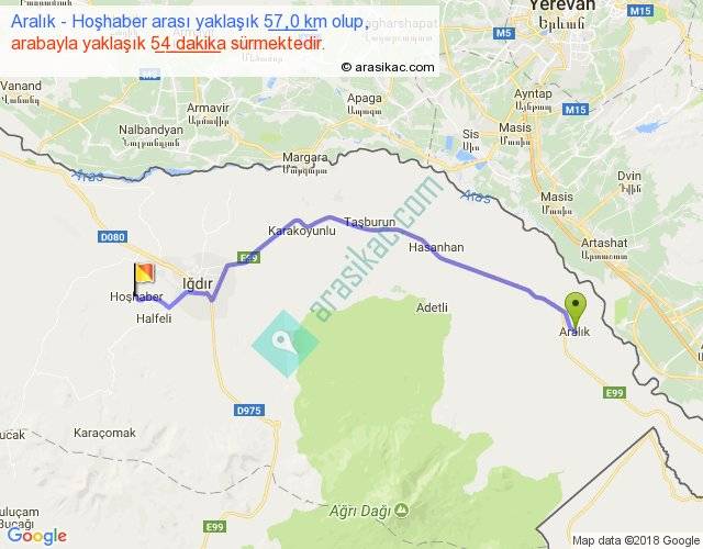 Aralık - Hoşhaber arası yaklaşık olarak 90 km/h ile yukarıda belirtilen sürede olup, iki yerin kuş uçuşu uzaklığı (mesafesi) 47'dir. Yolculuk otobüsle 1 saat 10 dakika sürmektedir.