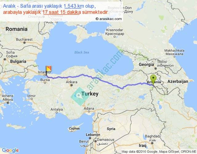 Aralık - Safa arası yaklaşık olarak 90 km/h ile yukarıda belirtilen sürede olup, iki yerin kuş uçuşu uzaklığı (mesafesi) 1289'dir. Eğer belirtilen yerler arasında uçak seferi var ise bu süre uçakla 1 saat 58 dakika'ya kadar düşebilir. Yolculuk otobüsle 22 saat 25 dakika sürmektedir.