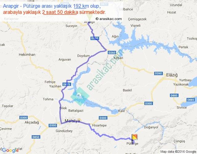 Arapgir - Pütürge arası yaklaşık olarak 90 km/h ile yukarıda belirtilen sürede olup, iki yerin kuş uçuşu uzaklığı (mesafesi) 99'dir. Yolculuk otobüsle 3 saat 41 dakika sürmektedir.