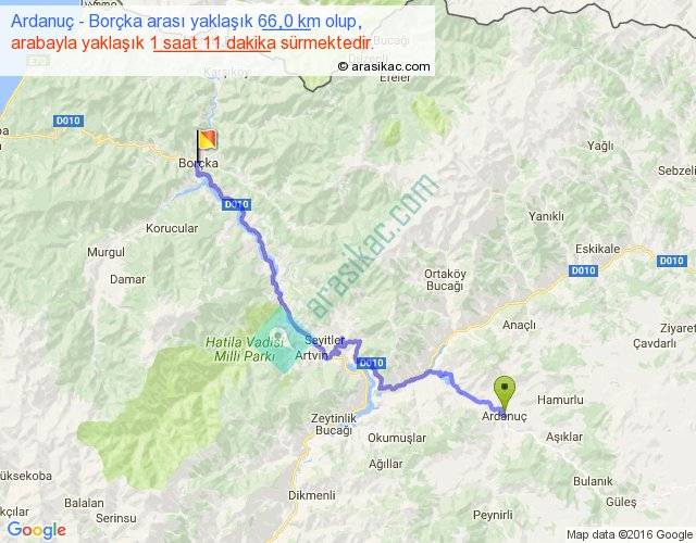 Ardanuç - Borçka arası yaklaşık olarak 90 km/h ile yukarıda belirtilen sürede olup, iki yerin kuş uçuşu uzaklığı (mesafesi) 42'dir. Yolculuk otobüsle 1 saat 32 dakika sürmektedir.