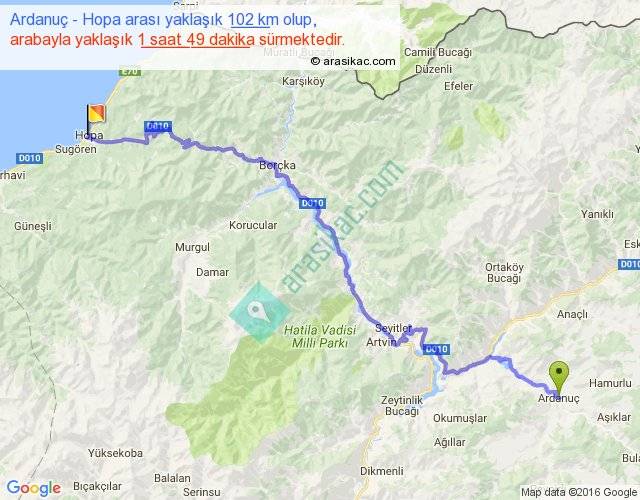 Ardanuç - Hopa arası yaklaşık olarak 90 km/h ile yukarıda belirtilen sürede olup, iki yerin kuş uçuşu uzaklığı (mesafesi) 61'dir. Yolculuk otobüsle 2 saat 21 dakika sürmektedir.