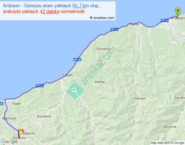 Ardeşen - Güneysu arası yaklaşık olarak 90 km/h ile yukarıda belirtilen sürede olup, iki yerin kuş uçuşu uzaklığı (mesafesi) 39'dir. Yolculuk otobüsle 54 dakika sürmektedir.