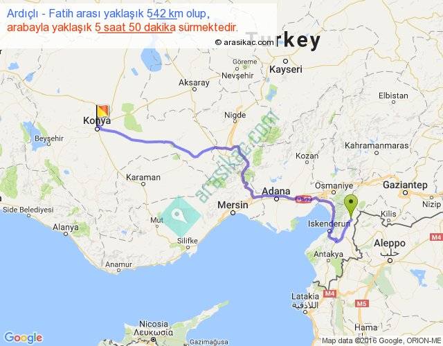 Ardıçlı - Fatih arası yaklaşık olarak 90 km/h ile yukarıda belirtilen sürede olup, iki yerin kuş uçuşu uzaklığı (mesafesi) 377'dir. Eğer belirtilen yerler arasında uçak seferi var ise bu süre uçakla 34 dakika'ya kadar düşebilir. Yolculuk otobüsle 7 saat 35 dakika sürmektedir.