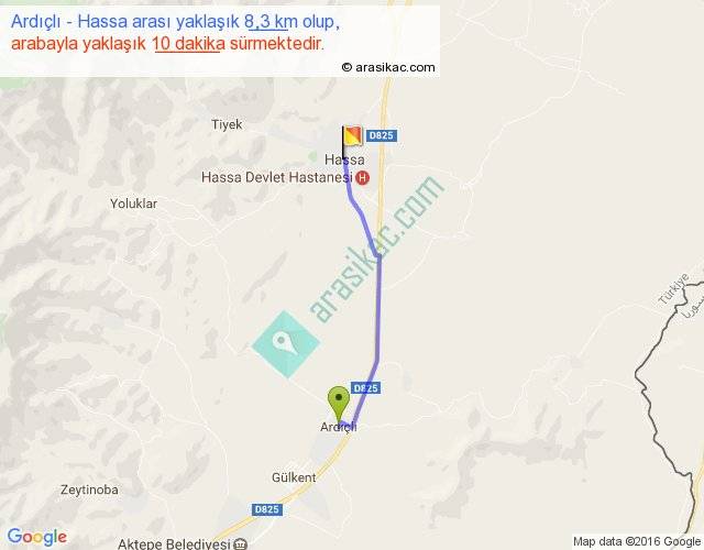 Ardıçlı - Hassa arası yaklaşık olarak 90 km/h ile yukarıda belirtilen sürede olup, iki yerin kuş uçuşu uzaklığı (mesafesi) 7'dir. Yolculuk otobüsle 13 dakika sürmektedir.