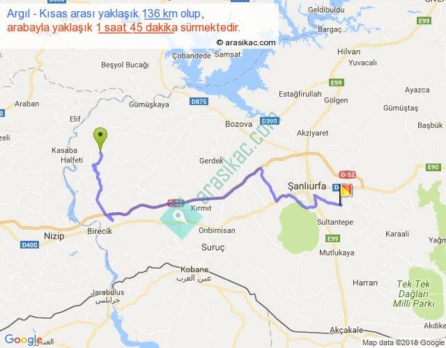Argıl - Kısas arası yaklaşık olarak 90 km/h ile yukarıda belirtilen sürede olup, iki yerin kuş uçuşu uzaklığı (mesafesi) 86'dir. Yolculuk otobüsle 2 saat 16 dakika sürmektedir.