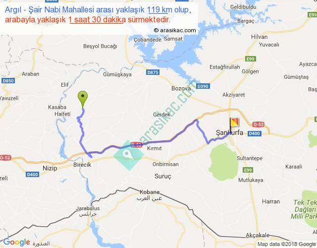 Argıl - Şair Nabi Mahallesi arası yaklaşık olarak 90 km/h ile yukarıda belirtilen sürede olup, iki yerin kuş uçuşu uzaklığı (mesafesi) 73'dir. Yolculuk otobüsle 1 saat 57 dakika sürmektedir.